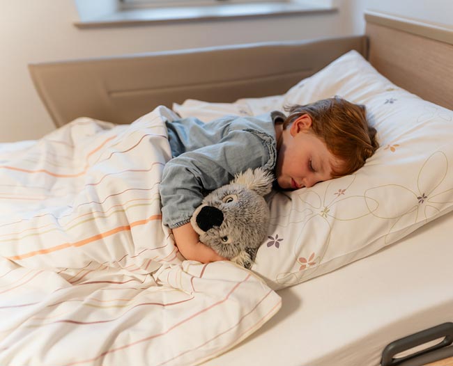 Unsere zwei familiären, barrierefreien Wohngruppen bestehen überwiegend aus Einzelzimmern. Platz für den Einsatz von Hilfsmitteln steht ausreichend zur Verfügung. Bei Bedarf kann eine Begleitperson (z.B. bei intensivpflichtigen Kindern, bzw. nach individueller Absprache) mit im Zimmer übernachten.